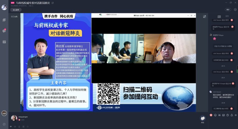 5月22日,长沙市第一医院呼吸内科副主任周志国为永利皇宫官方网站辅导员、学生“云端”讲授返校复学的防疫专题课。