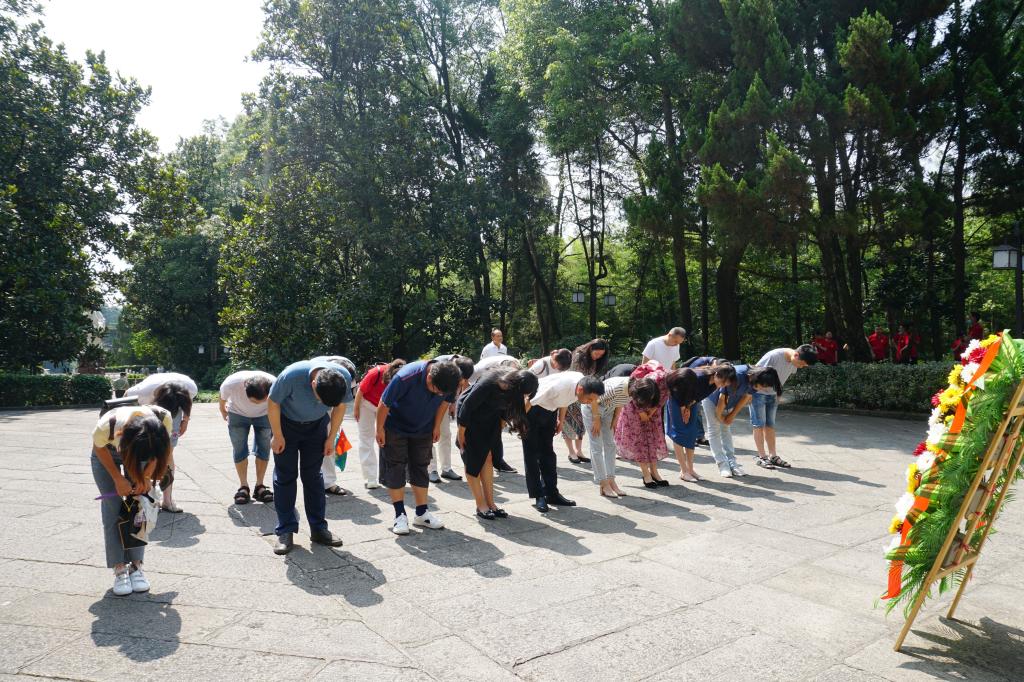 到达杨开慧铜像广场后,全体成员行鞠躬礼,敬献花篮。