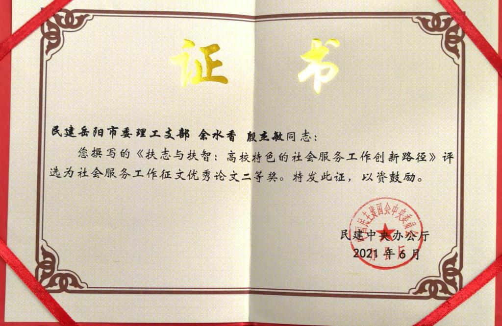 据了解,为适应新形势新任务新要求,认真总结社会服务工作经验,进一步提升民建社会服务工作水平,增强民建社会服务工作实效,今年3月,民建中央在全会开展社会服务工作征文活动。经民建中央评审小组认真评审,湖南省获奖作品共3篇,民建永利皇宫官方网站支部会员余水香、殷杰敏的文章《扶志与扶智:高校特色的社会服务工作创新路径》荣获优秀作品二等奖。